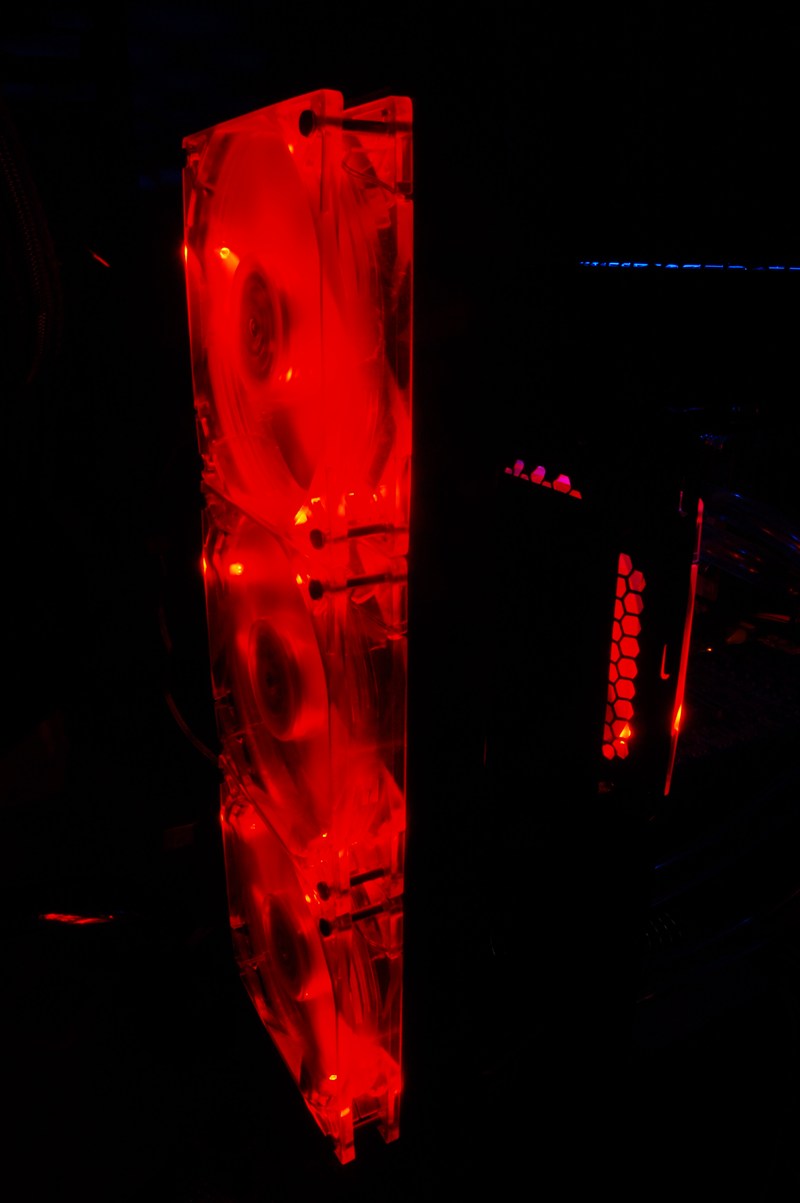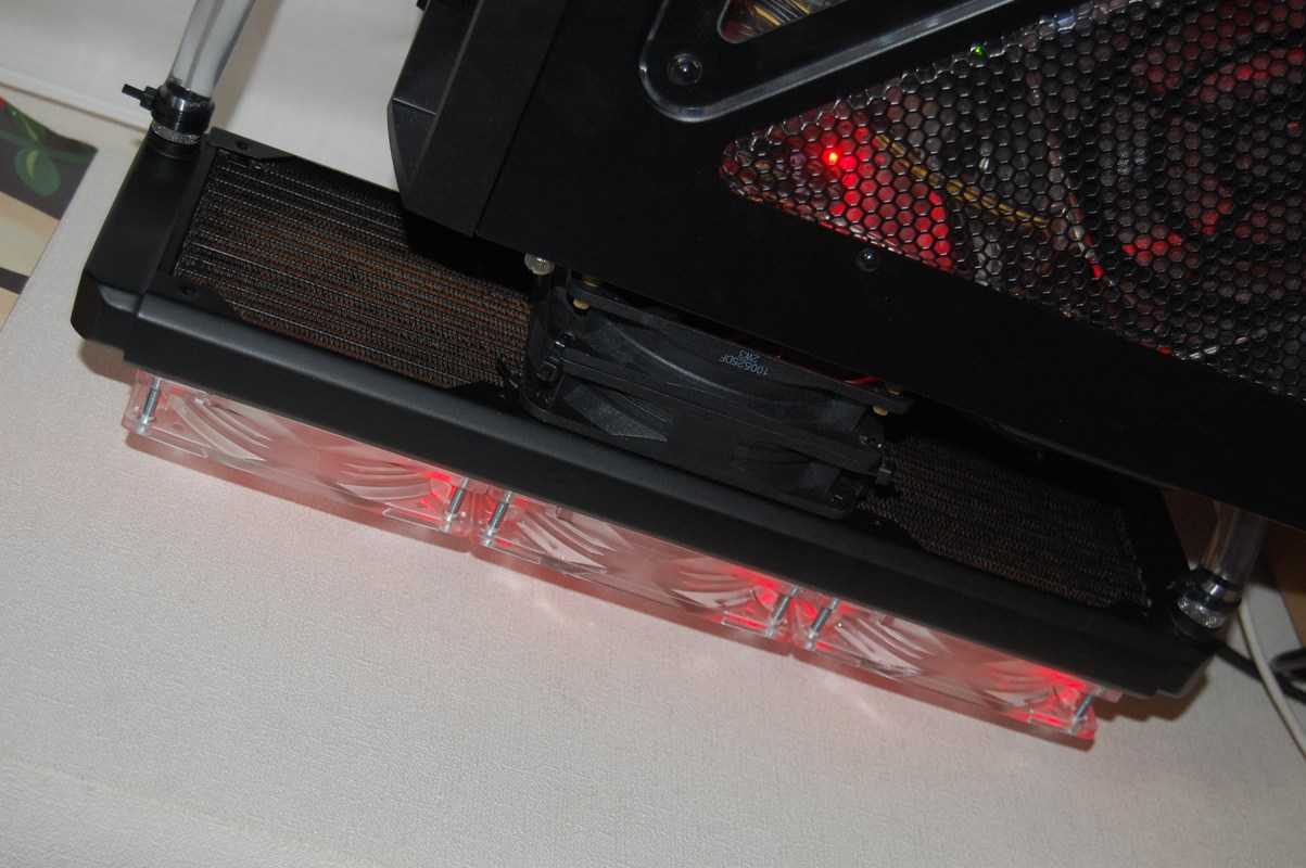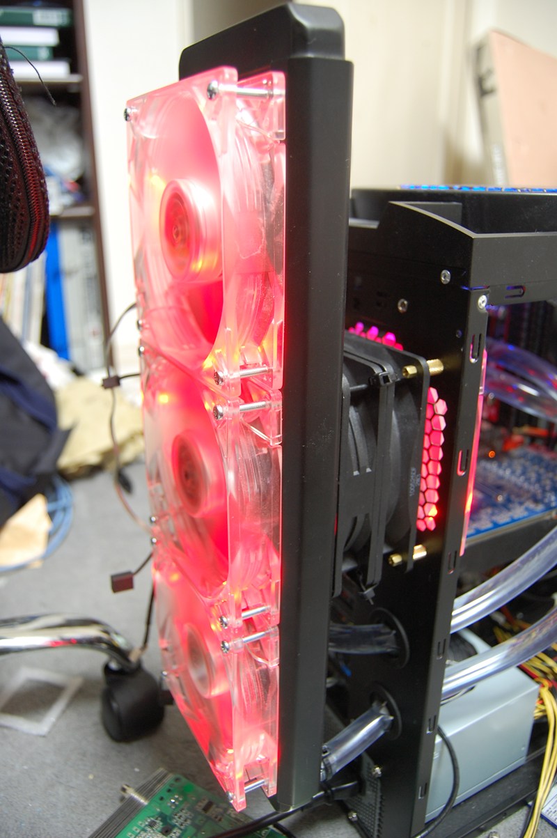 12cmファンを3つ搭載してます。本体とラジエータをつけてる部分は自作しました!!w