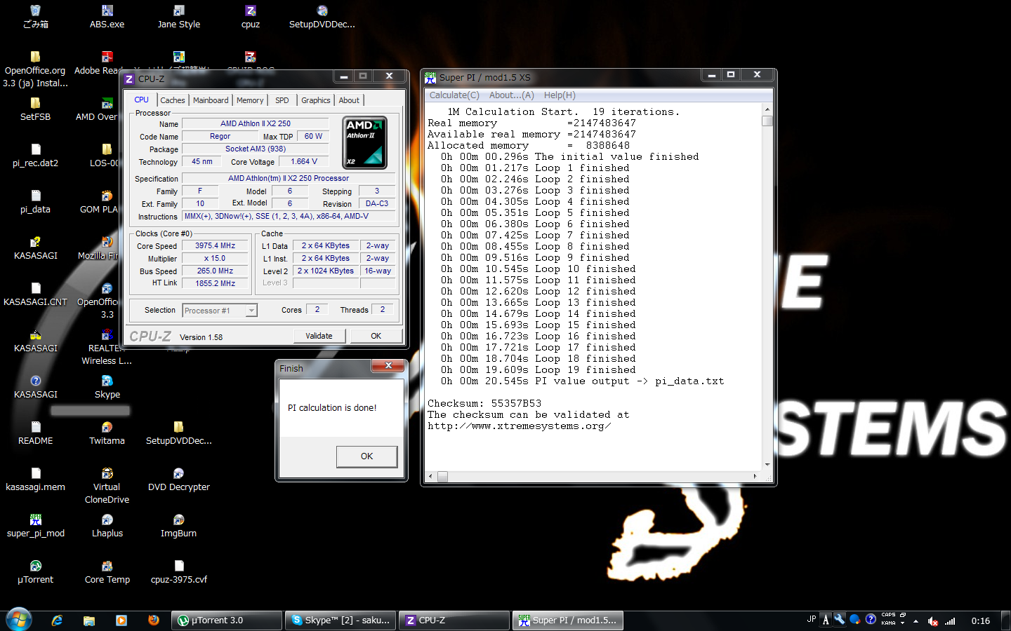 全然設定は詰めていませんが3.975GHzでSuper pi mod1.5xs 1M(104万桁)完走できましたっ!!